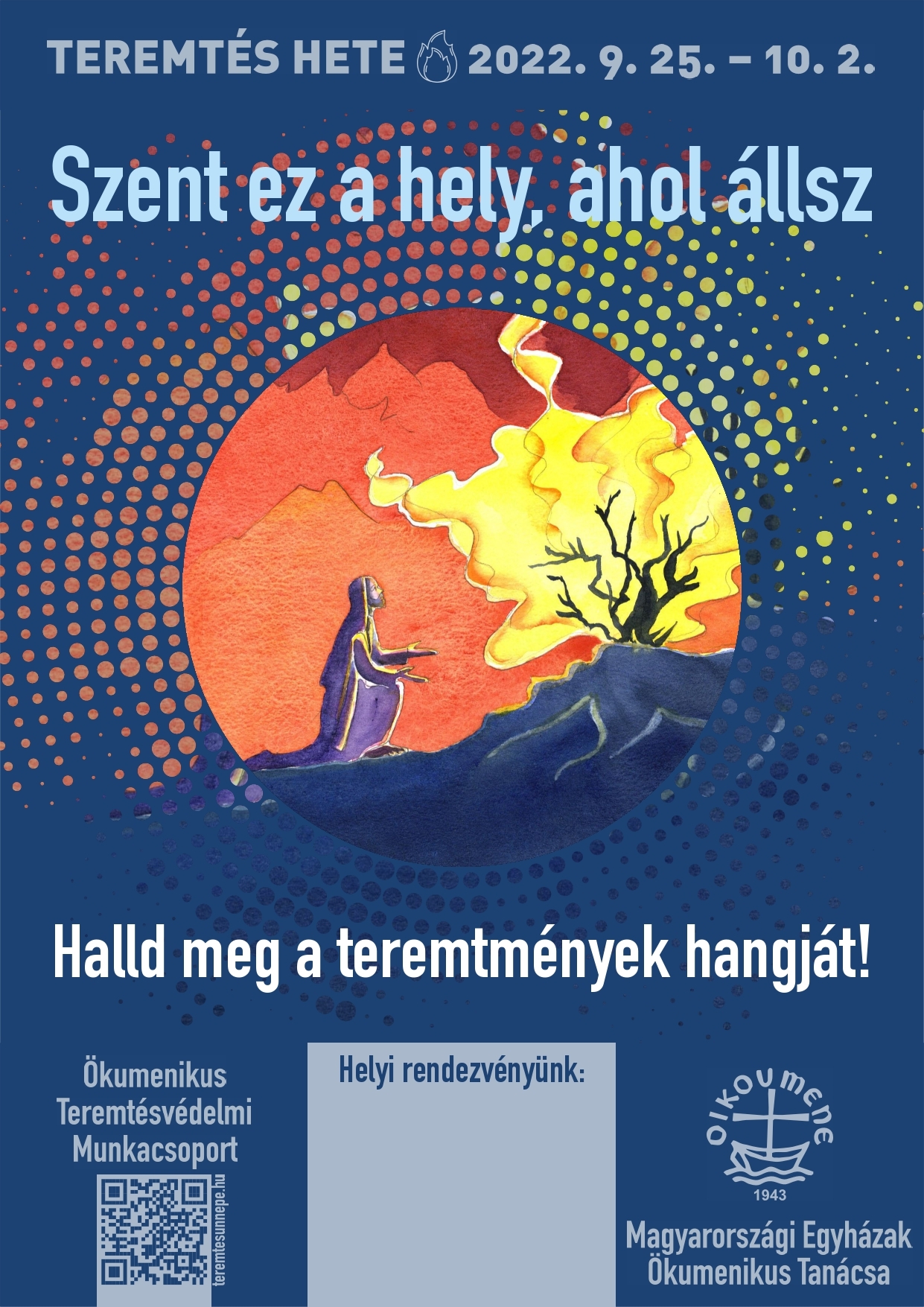 A keresztény felekezetek idén 14. alkalommal ünneplik hazánkban a teremtés hetét a teremtés ünnepének nemzetközi mozgalmához kapcsolódva. Magyarországon mindig az október első vasárnapját megelőző héten – idén 2021. szeptember 25. és október 2. között – tartják a teremtés hetet, amely a teremtés ünnepével, hálaadással ér véget. Ez az időszak különösen alkalmas, hogy figyelmünket a teremtett világ értékeinek megóvása felé irányítsuk. Ennek legszélesebb körben megvalósuló formái a helyi gyülekezeti kezdeményezések, programok, amelyekhez egységes plakátot és az Ökumenikus Teremtésvédelmi Munkacsoport által összeállított tematikus segédanyagot a MEÖT honlapjáról tölthetnek le. A teremtés hete idei témája: Szent ez a hely, ahol állsz.