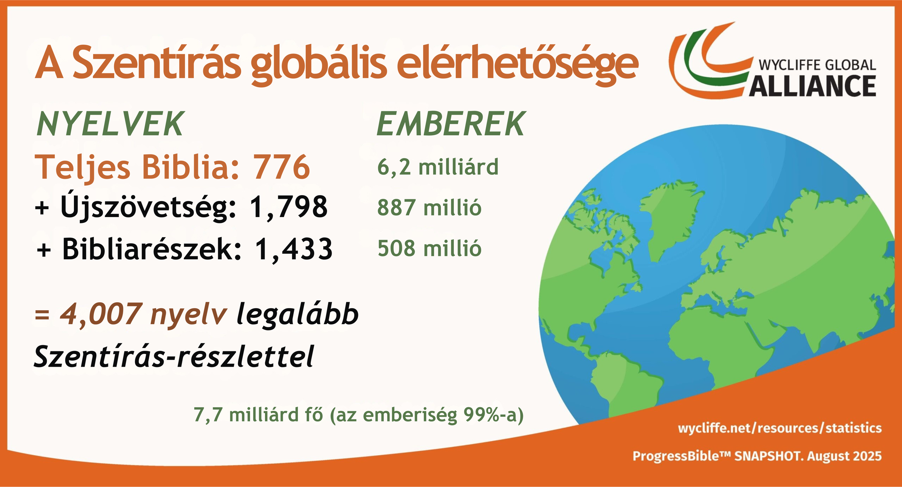 Több mint 7000 nyelvet tartanak számon a világon (egy 2025. szeptemberi adat alapján 7396-ot). Ehhez képest az, hogy 1999-ben még kétezer nyelven nem indult el a bibliafordítás, nagyon soknak tűnt, de Istennek hála 2025 augusztusában ez a szám már csak 544 volt. „Különösen az elmúlt években csökkent dinamikusan, talán annak is köszönhetően, hogy a fordítások nulladik lépcsőjében a mesterséges intelligenciát is felhasználják egy nyersfordítás elkészítéséhez, amely jó kiindulási alap lehet a további munkákhoz. Az is nagyon sokat számít, hogy mostanra már igen sok partnerszervezet bekapcsolódott a fordításokba. Közös törekvés és imatéma, hogy ez az 544-es szám ennek az évnek a végéig megközelítse a nullát.”