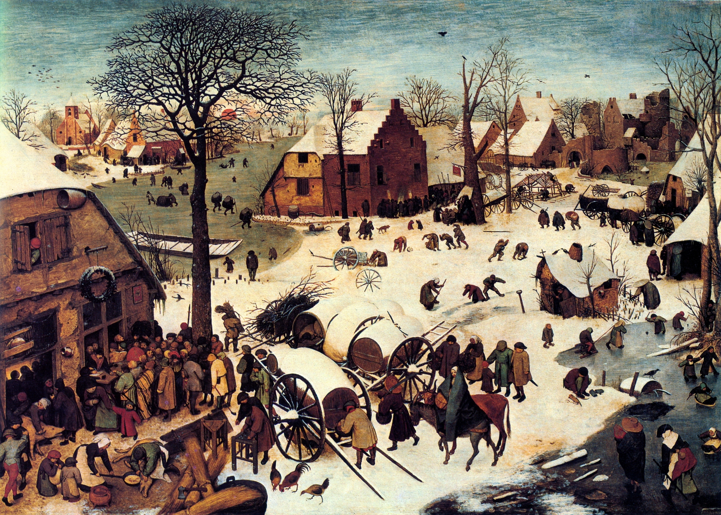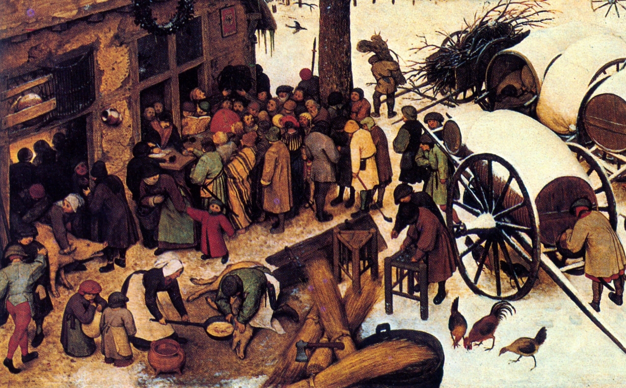 De minden magyarázatnál kifejezőbb a festmény, ahol a bibliai vendégfogadó ház és az elnyomó hatalom adóhivatala teljesen összefonódik. Bruegel nézőpontja mindig olyan, hogy bevonzza a szemlélőt, mintha mi is részesei lennénk megfestett világának. Olyan hely ez, ahol a mozdulatok semmi máshoz nem kötődnének, mint az azonnali igények kielégítéséhez. Túlzsúfolt világ, ahol mindenki megpróbálja kiszorítani magának a helyet. Bevágjuk a zsalukat év vége felé, hagyjanak békén. Kunyhókba, házakba, privát szférába menekülünk, ami csak a mienk. Ösztönlényként marakodunk a legjobb táplálékért, leárazásokért, energiaforrásokért. Keressük talán szemünkkel a bús bocit és a csacsit, amelyek majd az istállóban megmelegítik a kis Jézust, ám ezeket is Józsefnek kell magával hoznia. A hógolyózó gyerekek korán megtanulják az életben maradásért folyó harcot, a vidám játék eldurvul, a földön fekvőt lefogva közvetlenül fejbe vágják.