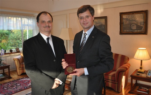 A Károli Emlékérmet köszönetképpen és a jövőbeli szoros együttműködés reményében adta át prof. dr. Balla Péter rektor a Magyar Köztársaság hágai nagykövetségén.