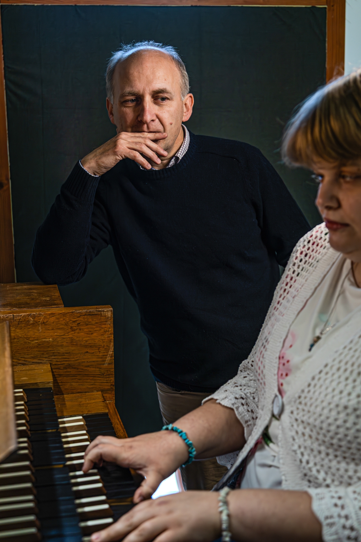 Felmerül, hogyan lehet megtanítani egy látássérült hallgatót „tájékozódni” az orgonán. Ragasztottak-e például tapintható jelölést a billentyűkre? – kérdezem Méhes Balázst. „Nem ragasztottunk, de le kellett szoktatnom arról, hogy ha leül a hangszerhez, belepötyögjön valahova, és az alapján állapítsa meg, hogy melyik hangot ütötte le. Mivel Laurának abszolút hallása van, így ez jó módszernek tűnt, ám mégiscsak furcsa hangverseny vagy istentisztelet előtt. Másképp, hang nélkül kell tájékozódnia a hangszeren” – magyarázza az orgonaművész. Egyetlen orgonista sem a kezét nézi, miközben kottát olvas, viszont „ahol nagyot kell ugrani a kezünkkel, mégis odapillantunk, például amikor a felsőről az alsó manuálra helyezzük át a kezünket.”