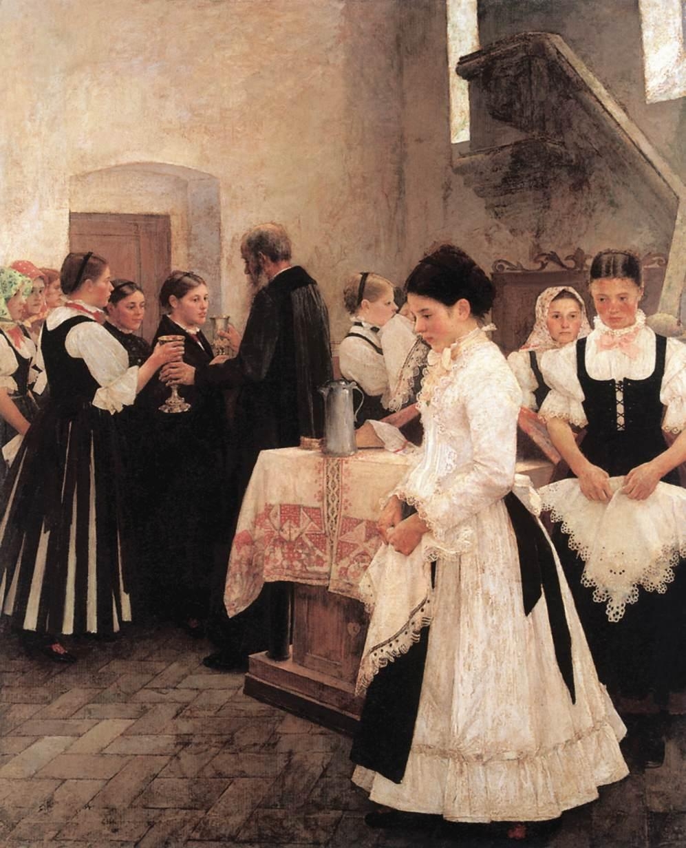 Az úrvacsorai jegyek alig láthatók. A kép mértani közepébe helyezve, az asztalra terített nemes sárközi varrottason a kenyér és a kancsó bor csupán jelzése annak, ami a történés láthatatlan lényege: az átszellemült gyülekezet valóságos részesedése Krisztus megváltói tettéből, értünk megtört testéből és véréből. Az isteni részesülésnek ez a csodája csapódik ki a megilletődött leányok arcán, minden feltételt mellőző egyszerű hitük elmélyülésében. Nem néznek semmi külsőségre, nem törődnek semmit a környezettel, tekintetük belül tapad meg, ott, ahol lelkük érintkezik az Isten országával. Ők Krisztus Menyasszonya, az Egyház. Ezért is ábrázolt a képen Csók István gyülekezetként kizárólag leányokat, feltehetően éppen ezen alkalommal konfirmáló és először úrvacsorázó szüzeket, hogy a gyülekezetnek menyasszony voltát, Krisztus elválasztott szent szerelmét, az eklekta küriát hangsúlyozza ki, aki most Vőlegényével titokzatos menyegzőjét üli.