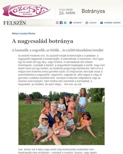 Botrányos jelenség a nagycsalád a 21. században. A buszon, villamoson gyakran megütköznek, ha valaki 4-5 gyerekkel utazik, egy nívós wellness-központban pedig egyenesen megkérdőjelezik, hogy képesek-e kifizetni a belépőt. A nagycsalád nem illeszkedik az individuumot piedesztálra emelő társadalom képébe, ráadásul rossz fogyasztó is - vélekedik Miklya Luzsányi Mónika.