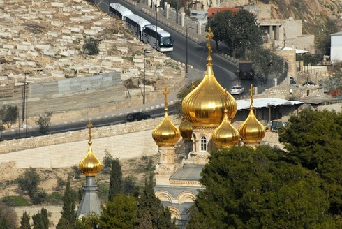 Az Olajfák hegyének lombsátra csillogó épületet rejt: a Mária Magdaléna-templom hét aranyszínű hagymakupolája bukkan elő. A görögkeleti templomot és kolostort III. Sándor cár építtette 1886-ban, édesanyja emlékére.