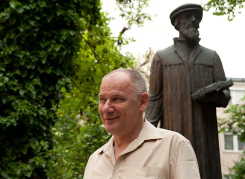 Szabó István kérésünkre idegenvezetőként debütál, mint mondja, már úgyis több szerepet kipróbált a Ráday utca 28-ban; volt teológushallgató, alkalmi portás és kazánfűtő, végül püspökként tért vissza. Barangolásunkat a teológia udvarán kezdjük Kálvin János szobra mellől.