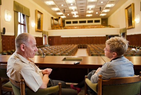 A díszterembe érve a püspököt arról kérdezem, hogy mi a különbség diákként, lelkészként ülni lent a sorokban, és püspökként a pulpituson.