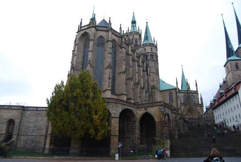 A következő nap első programja Erfurt, ahol Luther az Ágoston-rendi kolostorban élt. A város főterén a hatalmas gótikus katedrális a legszemtelenebb, amellyel csak találkoztam: a városnak a fenekét mutatja, s mintha még vissza is fordulna és kacsintana egyet: na mi van, nem tetszik? Bár alaprajza hagyományos és a főbejárat eredetileg az apszissal szemben van, a domborzati viszonyok miatt azt senki nem használja, így egy új kapu miatt valóban úgy néz ki, mint egy visszaforduló hernyó.