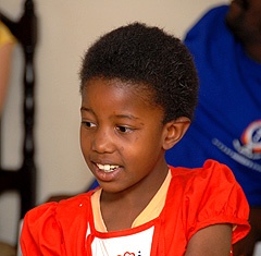 Az egyik kenyai kísérőnk megkéri a kicsiket, hogy mutatkozzanak be nekünk. Nem kell őket noszogatni, egyesével szépen sorjában, illedelmesen felállnak, majd angolul mindegyikük elmondja a nevét és a korát. Talán csak néhányuk szemében látom a megilletődöttséget, de ez csak addig tart, amíg nem énekelnek nekünk egy-két kedves kis dalt. Nem is gondoltam, hogy ennyire könnyen feloldódnak: vidáman, tapsolva köszöntenek minket az énekekkel, nem látszik rajtuk, hogy mások lennének mint a többi korukbeli 3-10 éves gyerek…