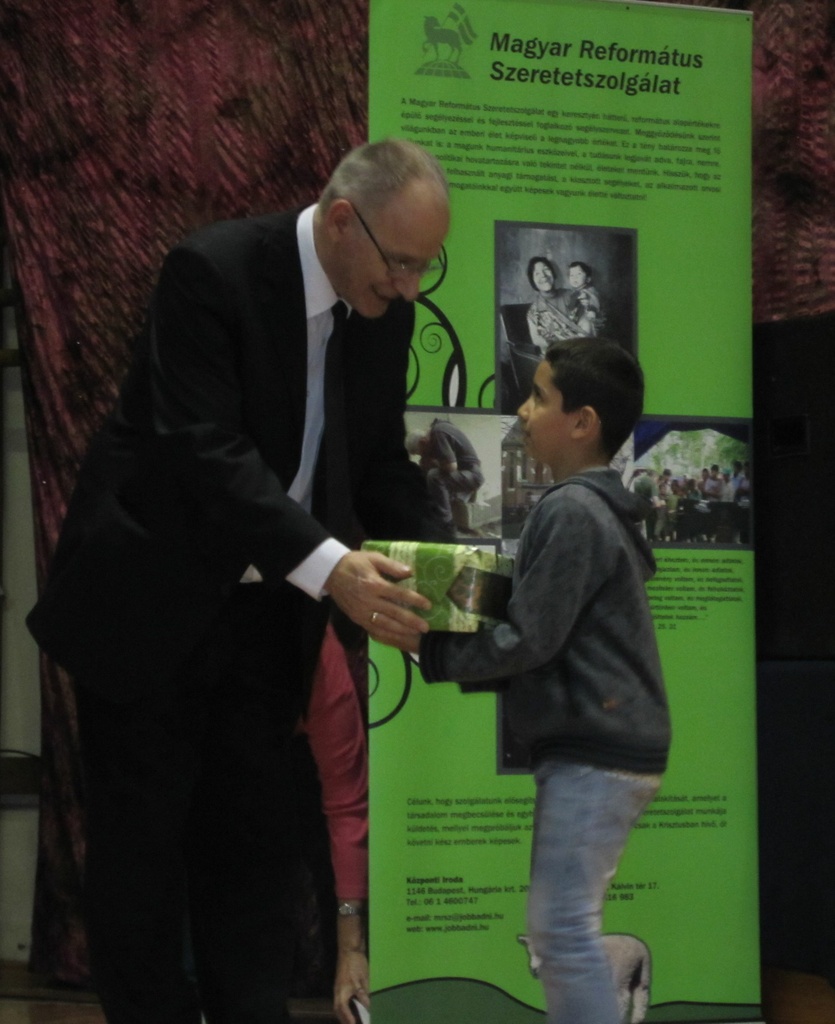 A csomagokban szeretet van – mondta Szabó István református püspök a 8. kerületi Deák Diák Általános Iskolában, mielőtt a gyerekek átvették a csomagokat. Egy csapat negyedikes fiú mellé telepedem le, és a karácsonyról, a szeretetről faggatom őket. Elemér Richárd azt mondja, hogy nem az ajándék a lényeg, hanem a szeretet. A szeretetet pedig akkor érzi, amikor a család együtt vacsorázik, beszélget. Három elsős kislány Amanda Judit, Lilla Blanka és Anna szintén arról beszél, hogy akkor érzik a szeretetet, amikor a szüleik átölelik őket. Karácsonykor örülni szoktunk és várjuk az ajándékokat, de fő a szeretet – teszik hozzá a hatévesek tévedhetetlen bölcsességével.