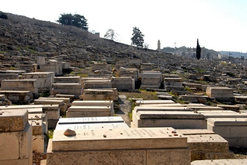 Az Olajfák hegyéről jól látszik az óváros a Templom-heggyel, távolabb pedig a Sion hegye. A szemlélődőt a Kidrón-patak völgye választja el az óvárostól, amelynek közelében feltárták a Dávid király és fia, Salamon korabeli Jeruzsálem maradványait. Útban Dávid városa felé szorosan egymás mellett elhelyezkedő sírok százaira láthatunk rá. Virág sehol, zsidó szokás szerint az elhunytak nyughelyére kis kövecskéket helyeznek a hozzátartozók.
