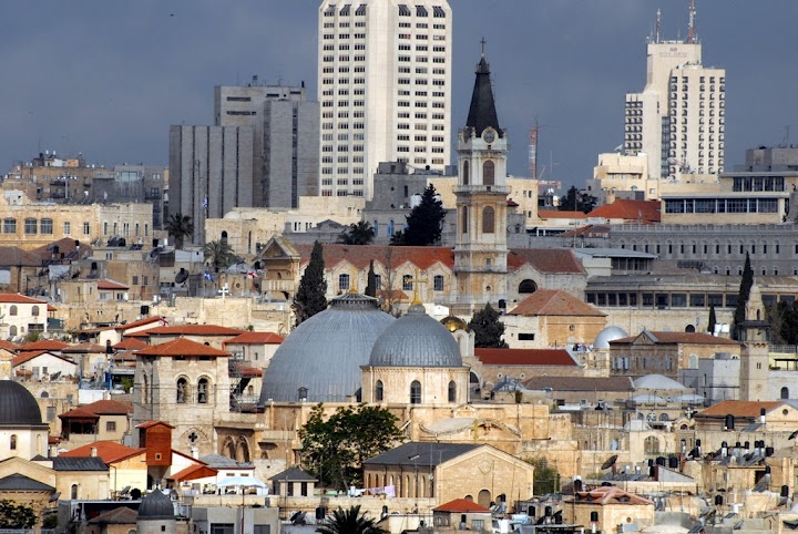 A homokszínű várost az Olajfák hegyéről nyíló látképén három szín emeli ki: a felhőtlen ég kékje, a mediterrán éghajlat növényeinek sötétzöld sávja és a Szentek Szentje helyén álló mecset kupolájának arany csillogása.