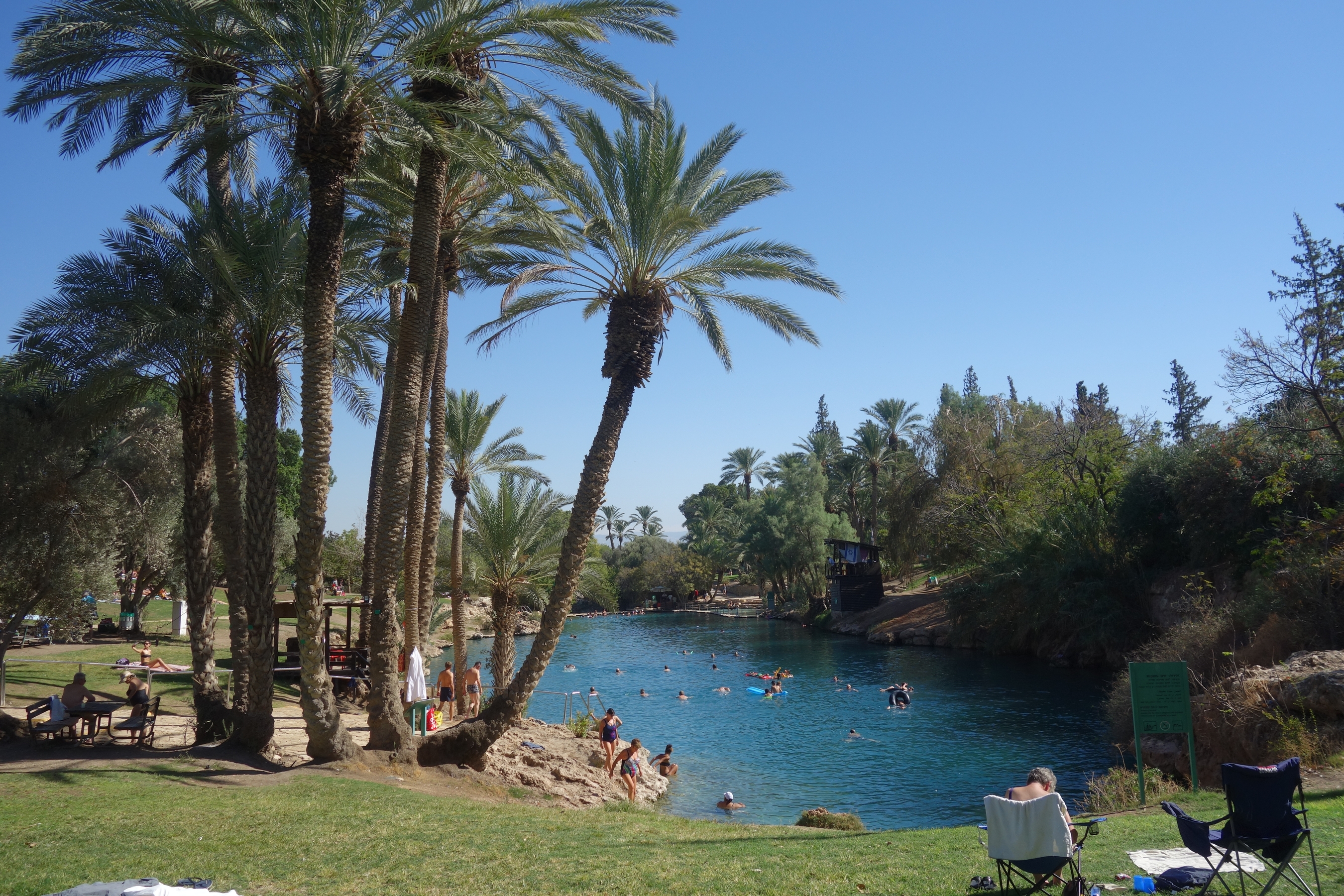 Olyan képződmény, melyet megpillantva az az érzésünk lehet, hogy valóban az édenkert egy kései mintájára bukkantunk. Oázis, hiszen felüdíti a turistalátványosságoktól, szent helyekről érkezett fáradt utasokat, akik újult erőre kapnak, amikor átússzák Sachne vagy más néven Gan Hashlosha több medencényi tavacskáját, a tengerszemet, melynek sziklás romantikus kövei, szelíd, vízre lógó füvei és a tóra hajló pálmafák üdítő látványa tényleg elvarázsolják az embert. Oázis, mondhatni édenkerti állapot, melybe merülve a kis és nagyobb halak csipkedik az ember lábát, már aki engedi, hagyja. Rendkívül érdekesek a fürdőzők hangjai, akiket irritálnak a folyton lábainkhoz tapadó halak, mégis visongva tűrik, kacarászva, látszólag fájdalmasan felvisítva. Az ingyen pedikűr csak fokozza az édeni állapotot az állandó 27-28 fokos vízben. Oázis, azaz a megpihenés, a regeneráció helye, amit azért él át az utas, hogy utána legyen ereje továbbmenni céljai felé. Az oázis ideiglenes hely, amely mégis az időtlenséget, az örökkévalóságot hordozza. Ilyennek alkotta meg a Teremtő a világot.