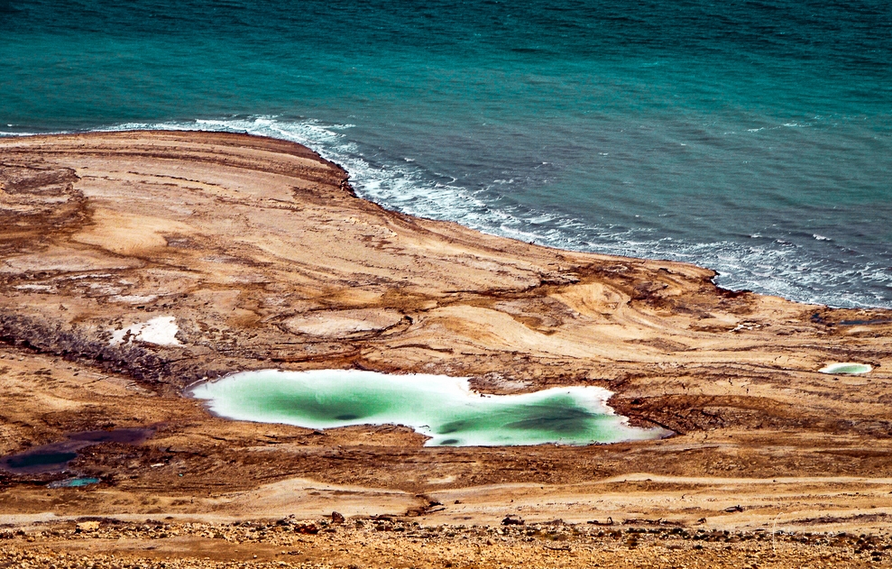 Földünk tengerszint alatti legmélyebb szárazföldi pontja a Holt-tenger a sivatag közepén, a kövek, sziklák rejtekében, a túlsó oldalon fönn a Nébó-hegy titokzatos fehérsége, fentebb Lót feleségének sziluettje bontakozik ki, feltételezhetően Sodoma és Gomorra hűlt helye, megdöbbentő üressége. Jóval a tengerszint alatt vagyunk, messzire ellátni, így szemlélhetjük a tó hosszú, türkizes hatású, a mélykéktől a világosig terjedő színskáláját. A parthoz közel érve tényleg érzékelni lehet, hogy az életnek egészen parányi jeleit sem látni, egy fűszálat, egy kis bokrot sem. Ez a tó tényleg halott, a hagyomány szerint ide veszik bele a fent említett két bűnös város is, semmi nyomot sem hagyva maga után Isten ítéletekor. Ha valaki belegázol, rögtön érzi, főleg apró horzsolásain át, a tó erős sókoncentrátumát, beljebb érve, bukdácsolva aztán hamar a hátán találja magát az ember, s elkezdődik a gondtalan lebegés. Jó lebegni, bekenni magunkat az éltető iszappal (itt ingyen kozmetikum), kitapogatni a talajt, ami nagyrészt szintén sóból van, és élvezni a fizika speciális törvényeit, a felhajtóerőt, az úszás képtelenségét. Szentföldi táj ez is, még akkor is, ha csak pár alkalommal említi a Szentírás. Az élmény megmarad, a körülvevő hegyek, dombok látványa, a valószínűtlen kékségek, a hamar ránk száradó só, s a végtelen lebegés érzése. A holt víz az élőket hordozza.