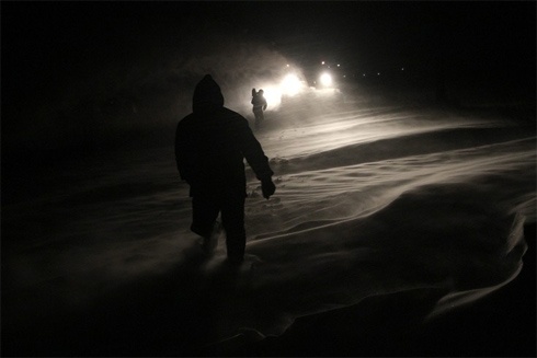 Aztán éjféltájban az áhított falu előtt pár kilométerrel süvítő szél feszül kisbuszunknak, a vihar vadul kavarja előttünk a havat, torlaszokat emel. A hófehér átfújások eleinte még szép fotótémának tűnnek, majd bevadul a táj, hótorlaszok emelkednek percek alatt a semmiből, jobbról is, balról is fal vesz körül, döccen a kisbusz, majd egy hókupac közelében megáll. Se előre, se hátra. Foglyok vagyunk. Viharos szél tépi magát, nekidörgölőzik a busznak, bent meleg van, csodálva csodáljuk az ablaküvegre rakódó kristályokat, mint akik nem is számolnak azzal, hogy a csodálatos és félelmetes hó fogságában is tölthetik az éjszakát.
