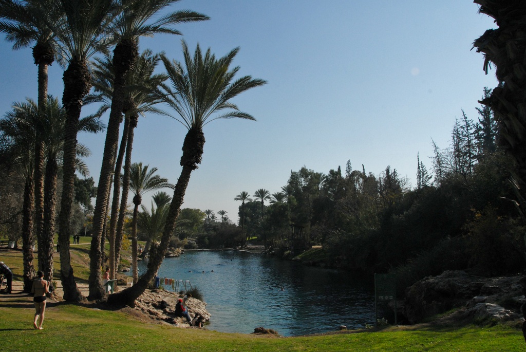 Sziklák, sivatag, az üres, maró illatú Holt-tenger, szárazság. Citromfák, datolyapálmák, narancsligetek, források, élő víz. Verőfényes, nyári idő Izraelben, minden tele virággal, gyümölccsel a novemberi esőzések után. Melegvízű forrás vizében fürdünk a szabad, decemberi ég alatt.