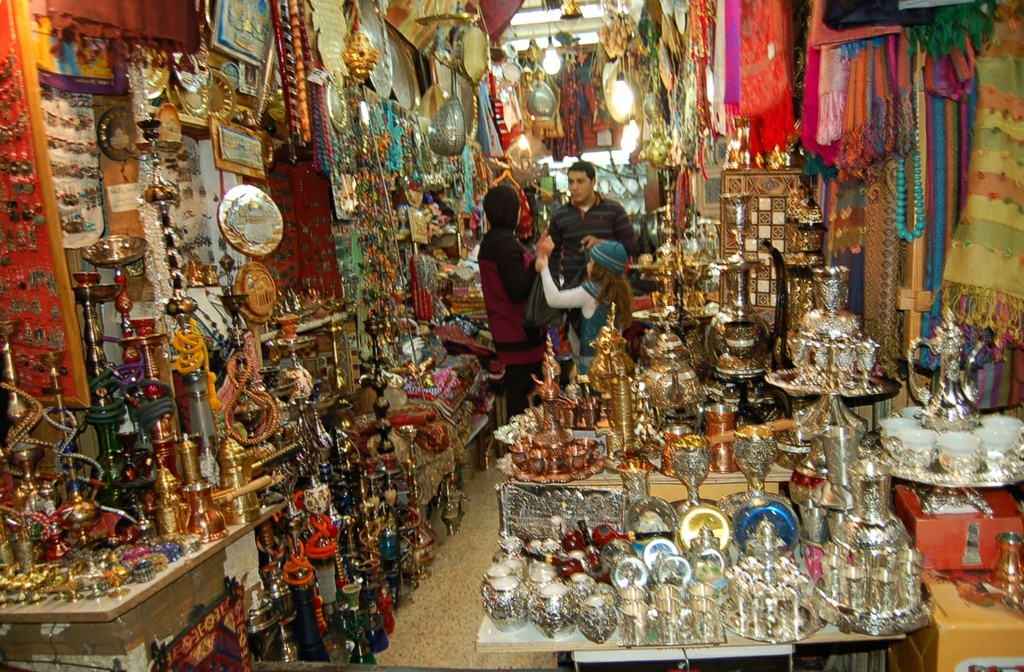 Zsidó és palesztin árusok vallásaik kommersz megjelenési formát öltő szimbólumait kínálják.