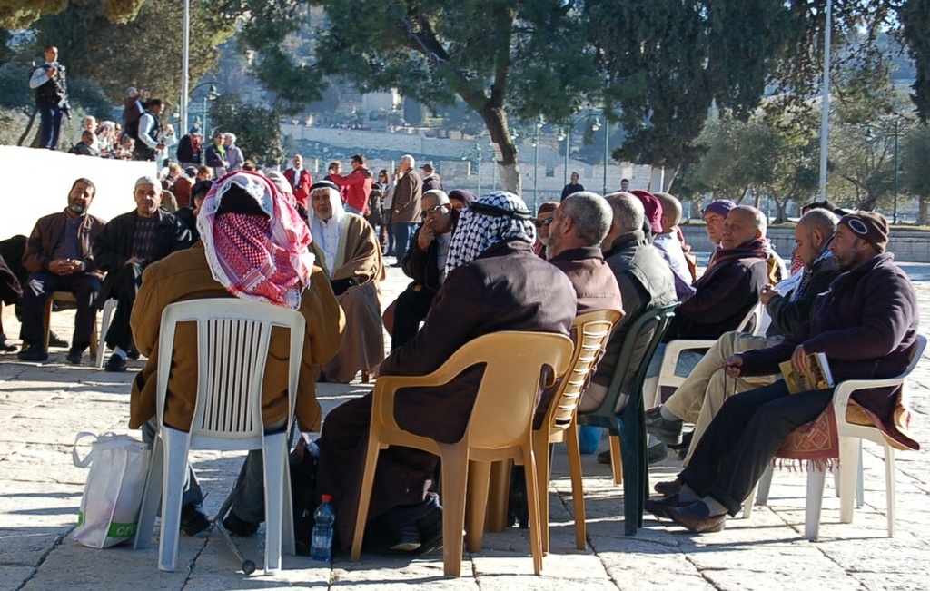 A zsidók inkább magányosan vagy kisebb csoportokban járják az utcákat, a muszlim férfiak a Szikla-mecset alatt ülnek körbe, hogy a Koránt tanulmányozzák. A világ legkülönfélébb helyeiről és nációiból érkező keresztyén csoportok vérmérsékletüknek, felekezeti hovatartozásuknak és személyes meggyőződésüknek megfelelően viszonyulnak a szent helyekhez: