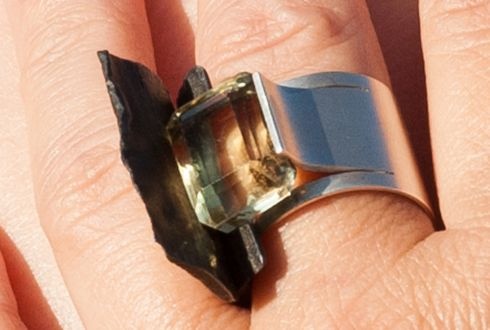 – A mesterem, Fehér Tibor ötvös az etyeki pincéje felújítása közben hasznavehetetlen, rozsdás vasakat talált, ez ihlette meg. A vas annyi mindent megélt már, és Tibor az idő értékét próbálta ékszerbe foglalni. Gyűrűket készített, aminek egy része vas, a bőrrel érintkező felület pedig ezüst. A néha brutális világot a rozsdás vas fejezi ki, ez vesz körbe egy-egy ékkövet, vagy gyöngyöt, ami legbelül Isten országát jelképezi.