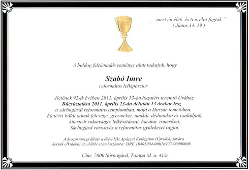 Szabó Imre 2011. április 13-án tért meg Teremtőjéhez.