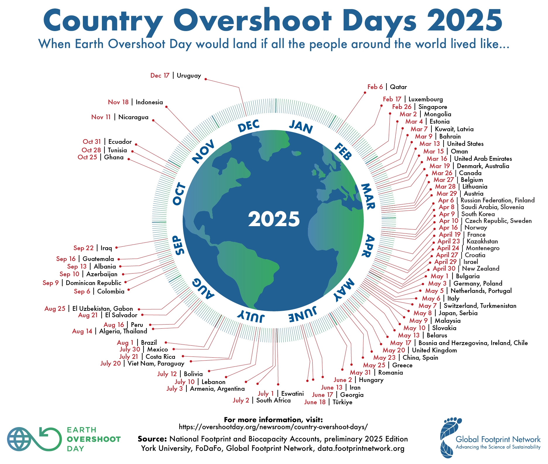 A Föld országainak Túlfogyasztási napja 2025-ben, ha minden ember a Földön az adott ország életmódja szerint élne (Forrás: https://overshoot.footprintnetwork.org)