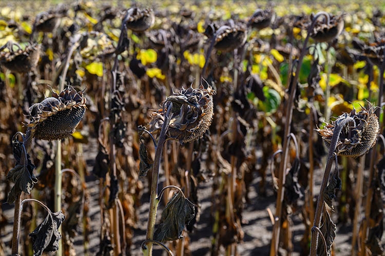 Elszáradt napraforgók a Fejér vármegyei, Sárszentmihály közelében 2024. augusztus 13-án (Fotó: MTI/Vasvári Tamás, forrás: https://www.agroinform.hu/)