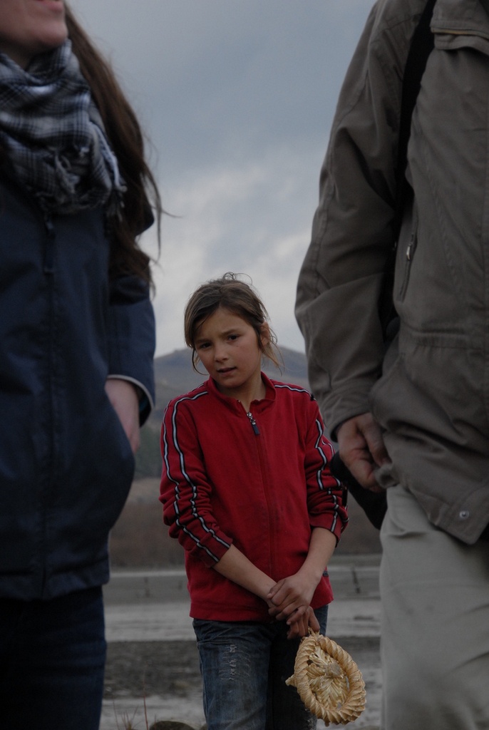 A faluba vezető sáros út tócsáiban meg-megcsillan a napfény. Itt csatlakozik hozzánk egy kislány, aki végig követ minket, kezében eladandó portékával. Szalmadíszeket árul. Veszünk tőle, persze. A néhány megmaradt ház udvarának egyikében fiatalember cigit kért. Sosem bántam, hogy nem dohányzom, de most örültem volna, ha adhatok neki valamit. Lehajtott fejjel jövünk el. A busz mellett a fűben húzkodjuk sáros cipőinket. Nagy a kontraszt, az erdőszentgyörgyi parókia tornácán a melegítő italok ezúttal józanítanak: pálinka, kávé, tea visszahoz az életbe és mindaz a kedvesség, ami mögötte van: a vendégszeretet természetessége a takarítás közben váratlanul beesett látogatóknak.