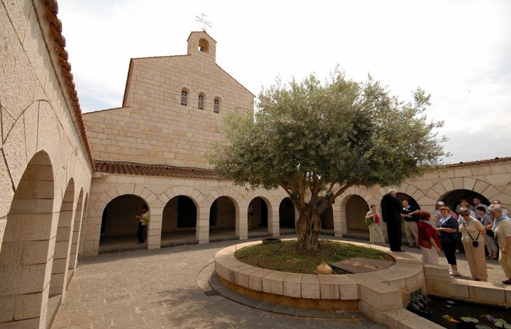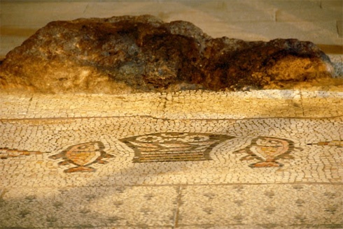 Ahogy a tó nyugati partján haladunk észak felé, a hét forrás vidékére jutunk el, melyet Heptapegon neve fémjelez. Az ősi város mai neve Tabgha, a hagyomány szerint itt lehetett az ötezer ember megvendégelésének helyszíne. A csodálatos kenyér- és halszaporításra emlékezve templomot emeltek itt. Az épület őrzi egy Kr. u. 4. századi bizánci kápolna romjait. Az ásatáskor előkerült mozaikokon látható a világszerte híres motívum: a két hal és a kenyerek.