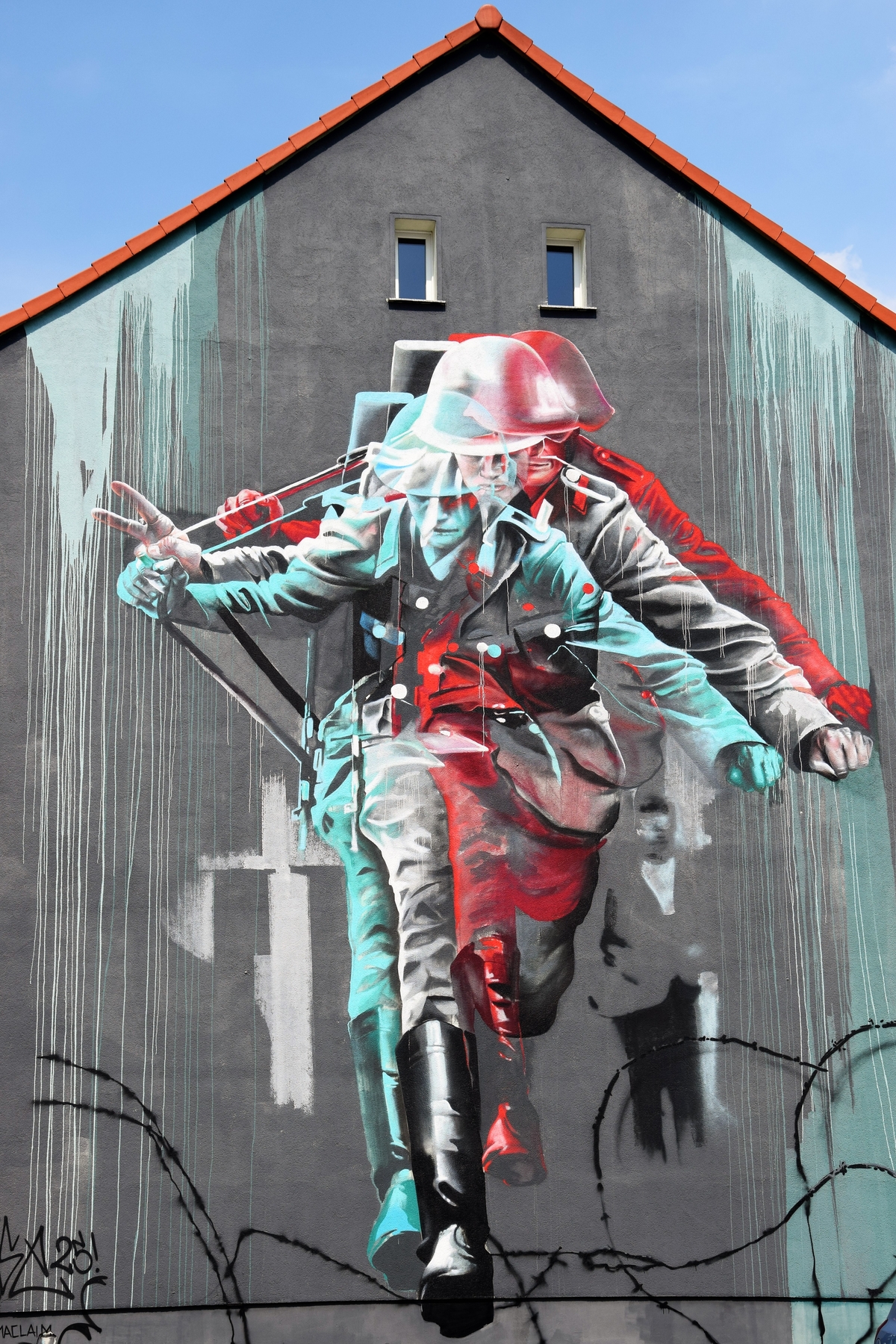 Az egyik ilyen képen például a tizenkilenc éves Conrad Schumann óriási alakja ugrik a Sternstrasséra a szögesdróton át. A graffiti a hidegháború egyik ikonikus fotójának állít emléket: „a szabadság ugrásának”, amelyet 1961. augusztus 15-én hajtott végre az NDK- határőr katona az akkor kétnapos, még nem betonból, csak szögesdrótból álló berlini falról, megszökve Kelet-Berlinből. Mi közünk nekünk mindehhez? Hogyan lesz ez a fiatalember a mi hősünk is? Például a szívélyes fogadtatást tapasztalva, amelyet a valamikori NDK területén magyarként kapunk. Az ország e részén ugyanis elevenen emlékeznek még a Balatonra, ahol végre találkozhattak a nyugatnémet oldalra került rokonaikkal, valamint az 1989-es páneurópai piknik lázas, feszültségteljes történelmi pillanataira, amikor néhány órára megnyílt a vasfüggöny a magyar–osztrák határon, reményt adva a Magyarországon veszteglő NDK-sok százainak, hogy hamarosan újra egyesül Németország. Ez az időszak, ez a de- és az azóta végbement (de napjainkig tartó) társadalmi re-formáció a mai napig élő és eleven sokak emlékezetében.