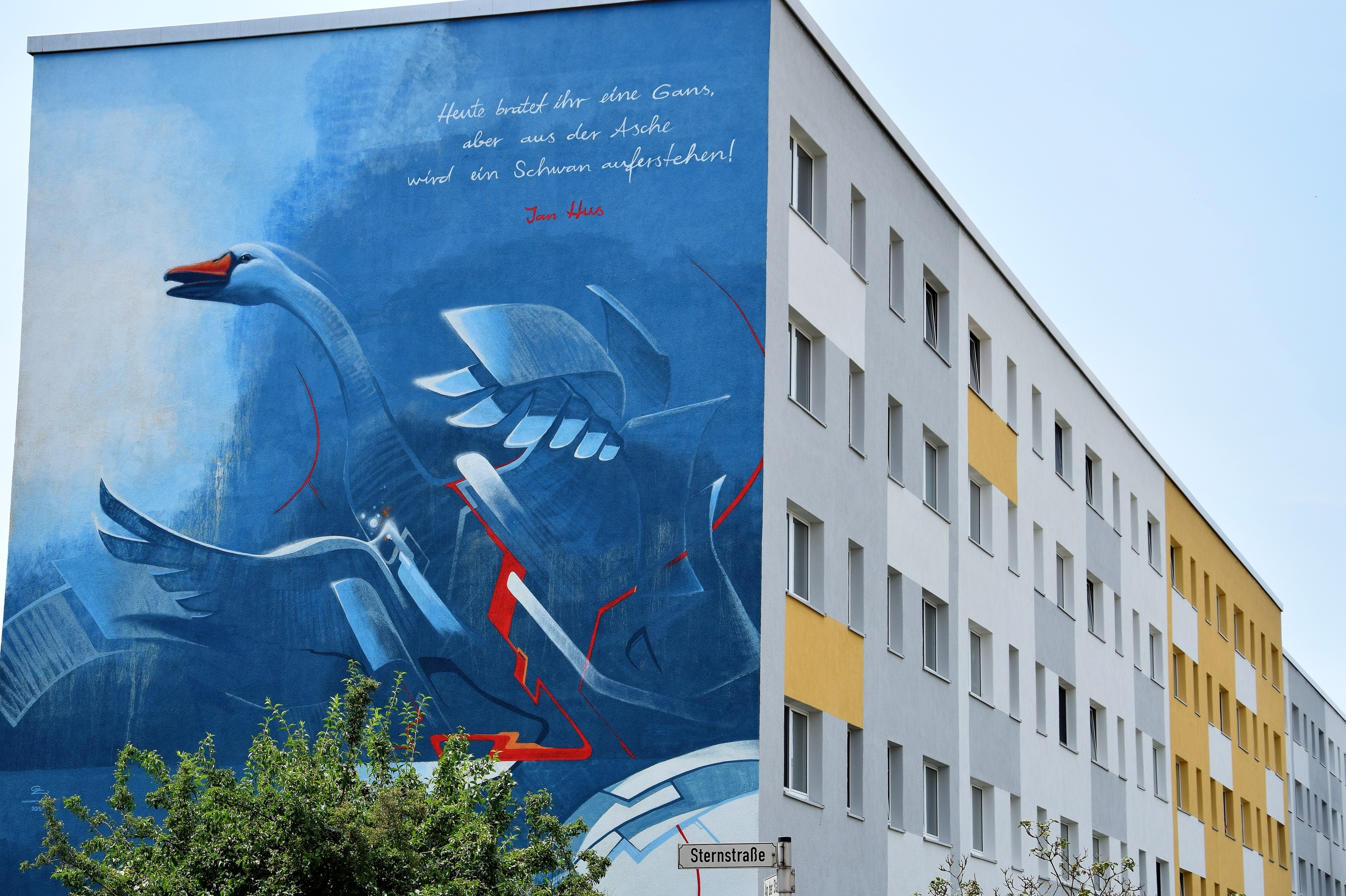 A két falfestmény között félúton valódi reformációs tűzfalra lelünk: Husz Jánosnak állít emléket az óriási festmény. A huszitizmus atyját – akinek vezetékneve csehül libát jelent – hatszázkét éve, 1415. július 6-án égették meg Konstanzban. A neki tulajdonított mondás – amely valószínűleg sokkal inkább Luther Mártontól származik, és amelynek jövendölését magára vonatkoztatta – szintén ott olvasható a falon: „Ma megégettek egy ludat, száz év múlva azonban egy hattyú jön majd, akit nem égethettek meg.”