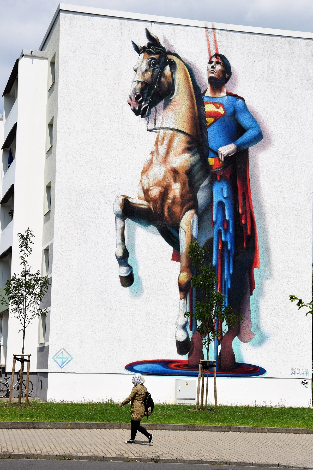Másik, részben nagyon egyéni, másrészt nagyon is egyetemes átformálódásra emlékeztet az onnan pár száz méterre lévő, hatalmas Superman-ábrázolás: a piros sugarakat lövellő tekintetű, lóháton ülő hős deréktól lefelé magatehetetlen, cseppfolyós anyagként csorog alá a házfalon. A karaktert alakító színész, Christopher Reeve 1995-ben szenvedett súlyos balesetet egy lóversenyen, ahol a harmadik akadálynál lova megtorpant, és levetette őt magáról. Így került a valamikor Supermant játszó Reeve nyeregből tolószékbe, nyaktól lefelé megbénulva. Az elfolyó idő furcsa memento mori a hatalmas képen.