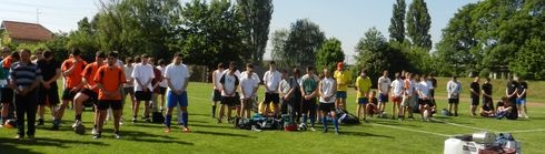 A református focikupa előtt együtt imádkoznak a fiatalok. Talán azért is fohászkodnak, hogy ők nyerjék meg a tornát.