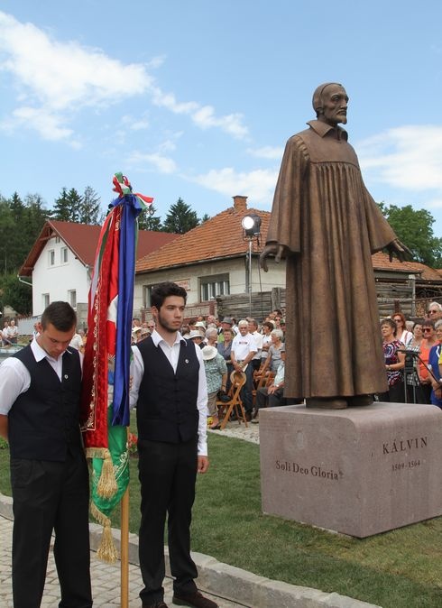 A köszöntő beszédeket követően a résztvevők átvonultak a Kálvin térre, ahol leleplezték Kálvin János szobrát. Az első erdélyi, egészalakos köztéri Kálvin szobrot Bocskai Vince európai rangú szovátai szobrászművész készítette, akinek köztéri alkotásai Erdély-szerte megtalálhatók. A 240 cm magas bronzból készült alkotását Kató Béla püspök, valamint az ötletgazda, Incze Sándor nyugalmazott esperes, a Székely Mikó Kollégium Alapítvány elnöke, és Antal Árpád, Sepsiszentgyörgy polgármestere leplezte le. A szobor leleplezését követően Kató Béla elmondta, a székelység számára mindig is fontos volt a nagy reformátor. „Kálvin tanítása ugyanis immár 450 éve jelen van a nyugati kereszténység székely végváraiban, nemcsak hallgattuk, hanem meg is hallottuk szavát, és megláttuk azt, akire ő mutatott: a megváltó Jézus Krisztust. Ő formált át, Ő tartott meg, és egyedül Ő lehet a reménységünk. Jean Calvint viszont nagyon hamar befogadtuk, Kálvin Jánossá lett, és Kézdiszéken úgy tartják, hogy élete végén Erdélybe érkezett. A hagyománynak semmilyen történelmi alapja nincs, csupán azt jelzi, hogy az üldözött, annyiszor menekülni kényszerült genfi reformátort magyarrá, székellyé fogadtuk, tekintélye nagyobb a magyar reformátorokénál." A püspök méltató beszéde után Gottfried Locher, a Svájci Protestáns Egyházak Szövetsége Tanácsának elnöke, Balog Zoltán miniszter, Kelemen Hunor miniszterelnök-helyettes, az RMDSZ elnöke, Antal Árpád Sepsiszentgyörgy polgármester és Ince Sándor szólt az egybegyűltekhez. Ezt követően ünnepi istentiszteletre és úrvacsoraosztásra került sor. Isten Igéjét Bölcskei Gusztáv, a Magyarországi Református Egyház zsinati elnöke hirdette, az úrvacsorai liturgiai szolgálatot pedig Bogárdi Szabó István dunamelléki püspök végezte. A Kálvin téren megterített asztaloktól több tucat lelkész osztotta az úrvacsora jegyeit az ünneplő gyülekezetnek.