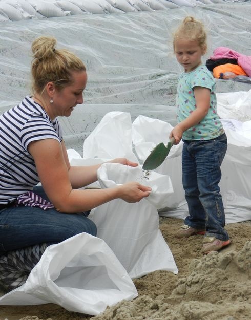 Közben kislányuk, Rozika fáradhatatlanul rakja kis lapátjával a homokot a zsákokba.