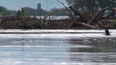 Jön a víz megállíthatatlanul. A virágzó falvak mentén hatalmas sárga munkagépek tornyozzák a földet. Lassan autózunk úticélunk felé, közben figyeljük a víz alá került termőföldeket, és a szorgos önkénteseket, akik homokzsákokkal védik, amit csak lehet. Az út szélén lapátolók gúnyosan kiáltanak utánunk a kameránk láttán: inkább jönnétek segíteni! Kívánságuk hamar teljesül: Leányfalun csatlakozik hozzánk egy fiú. Marci ugyan másnap érettségizik, mégis a homokzsákolást választotta a tanulás helyett.