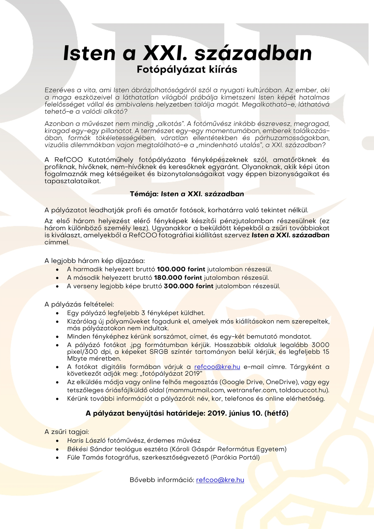 A RefCOO Kutatóműhely fotópályázata fényképészeknek szól, amatőröknek és profiknak, hívőknek, nem-hívőknek és keresőknek egyaránt. Olyanoknak, akik képi úton fogalmaznák meg kétségeiket és bizonytalanságaikat vagy éppen bizonyságaikat és tapasztalataikat.