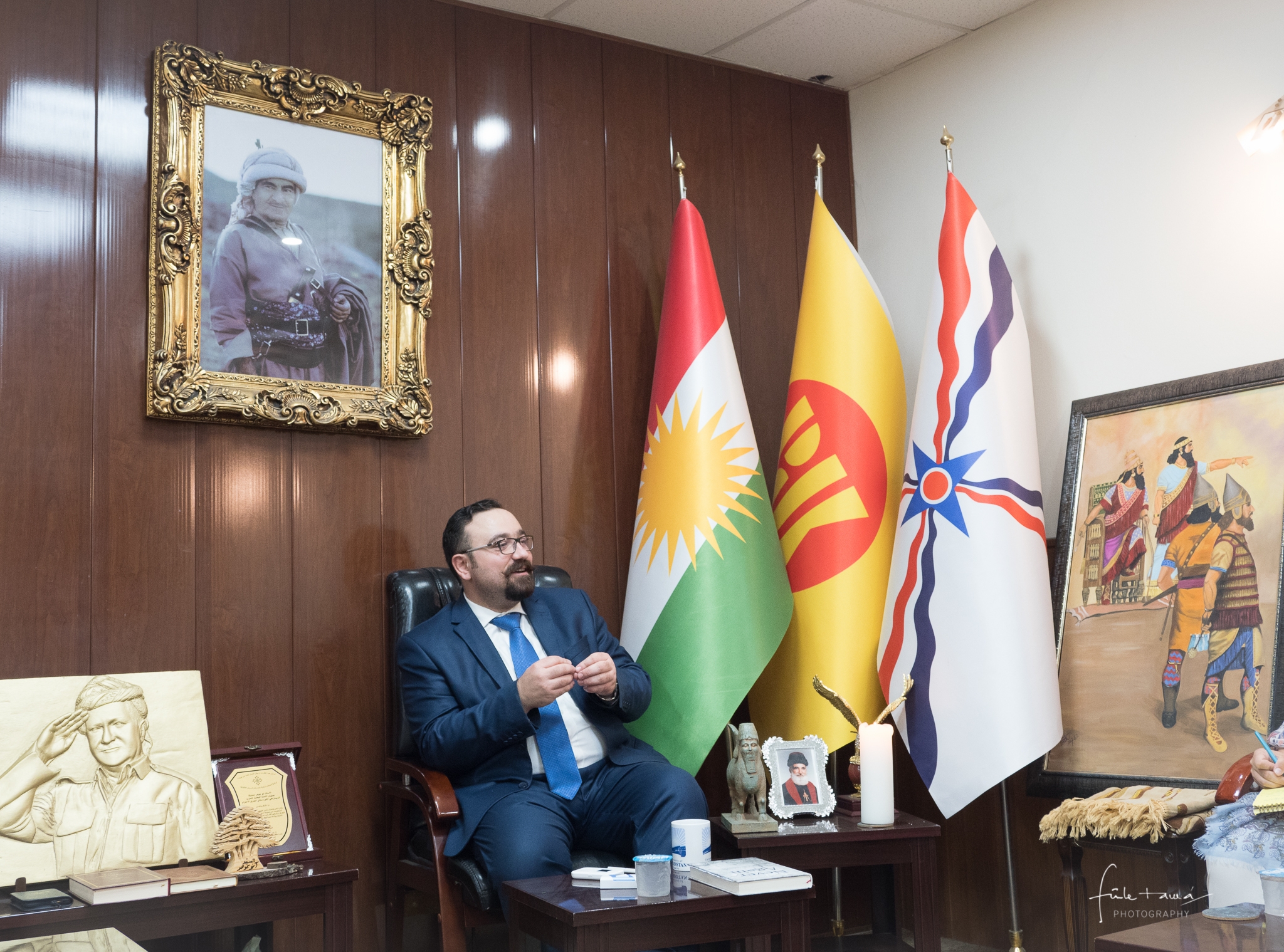 Amióta itt vagyunk, megtanultam, hogy a hőség és a szomj ellen a forró tea a legjobb védekezés. Miután hellyel és teával kínálnak, diszkréten szemügyre veszem a számomra egzotikus környezetet. A falakon a még hivatalosan el nem ismert ország vezető politikusai, Mustafa és Masoud Barzani fényképe, emlék az iraki üldözött keresztények ügyét szerte a világban képviselő Bashar Warda érsek látogatásáról, Martin Luther King portréja és egy egykor fáraókat leigázó asszír királyról készült rajz. Az iraki keresztény politikus irodájában épp megbeszélés zajlik, a beszélgetőpartnerek imafüzért morzsolgatnak. Segít koncentrálni, mondja valaki, és feszültségelvezetőnek sem utolsó. Ebben az elképesztő arcképcsarnokban lassan feldereng, mi a közös a történelmi alakokban. Mind vezetők, mind kockázattak, és egy nehéz korban mind sikerre vitték küldetésüket. Szükség van itt a példájukra. Látogatásunk alatt ugyanis egyetlen kérdés van, amire végig nem kapunk megnyugtató választ: hogy az Irakban élő kurdok és keresztények számára van-e remény egy jobb életre – legalább gyermekeik számára.