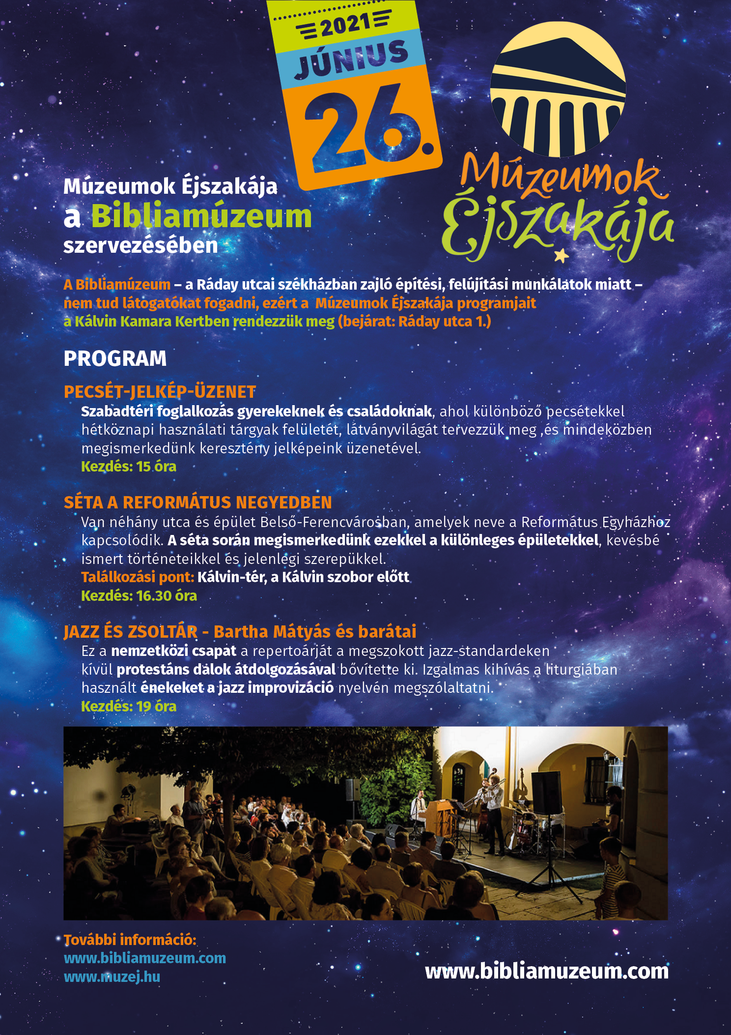 A Múzeumok Éjszakáján valamennyi, a Bibliamúzeum szervezésében megvalósuló program ingyenesen látogatható védettségi igazolás felmutatásával. A Kálvin Kamarakert bejárata a Ráday utca 1. szám felől közelíthető meg.