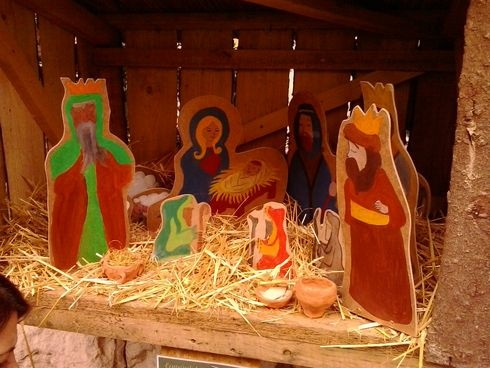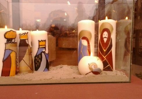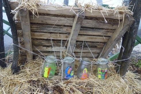 Pálos Anna képzőművész, művészetterapeuta szokatlan betlehemnél időzik hosszasan. A szalmán négy üveg sorakozik egymás mellett, amelyekre gyermekkezek festhették a három királyokat, a pásztorokat, Józsefet és Máriát.
