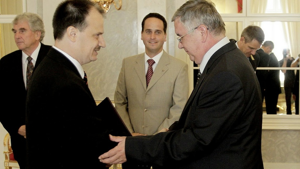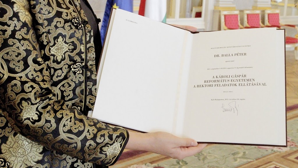 Átvette Schmitt Pál köztársasági elnöktől kinevezését Balla Péter egyetemi tanár, a Károli Gáspár Református Egyetem új rektora a budavári Sándor-palotában.