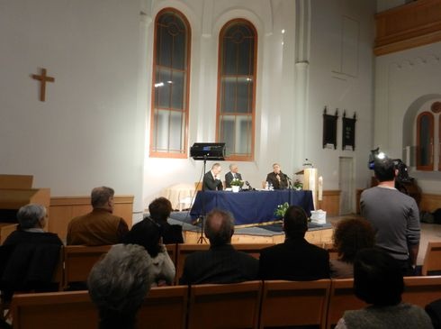 Kárhozatos bálványimádás, eucharisztia, egyházszakadás, hitviták. A laikus csak kapkodja a fejét, és felteszi a kérdést: miért is fontos a 21. században olyan kérdésekről vitatkozni, amelyek a kívülállók számára teljesen lényegtelennek tűnhetnek. A téma nehézségét talán az is mutatja, hogy csupán egyetlen református teológai hallgatót lehetett felfedezni a nézők között, a disputa az érettebb közönséget vonzotta. A Protestáns tavasz elnevezésű rendezvénysorozat csütörtök esti programján az eucharisztiáról cserélt eszmét Bogárdi Szabó István, a Dunamelléki Református Egyházkerület püspöke, valamint Barsi Balázs ferences szerzetes. A beszélgetés apropóját az adta, hogy nagy vihart kavart a református zsinat tavalyi döntése, amely elvetette azt a javaslatot, hogy a Heidelbergi Káté új fordításából hagyják el a 80. kérdést, vagy lássák el lábjegyzettel. Az említett kátékérdés elítéli a római katolikus misét, mert úgymond a mise azt tanítja, „hogy Krisztus testileg jelen van a kenyér és bor színe alatt, és ezért ezekben kell őt imádni. A mise így alapját tekintve megtagadja Krisztus egyszeri áldozatát és szenvedését és ezért kárhozatos bálványimádás. "Nagyon leegyszerűsítve: a zsinat döntését sok római katolikus arculcsapásként értelmezte. Az ennek nyomán kibontakozó vita érlelte meg a beszélgetést a szerzetes és a püspök között. Valóban arról van-e szó, hogy a 16. század óta sem a római katolikus, sem a református felfogás nem változott semmit? Vagy történtek érdemi közeledések, amelyek nyomán másképp vitathatjuk meg a lényegbevágó kérdéseket? Szükség van-e arra, hogy a felekezetek ezekről is szót váltsanak egymással?