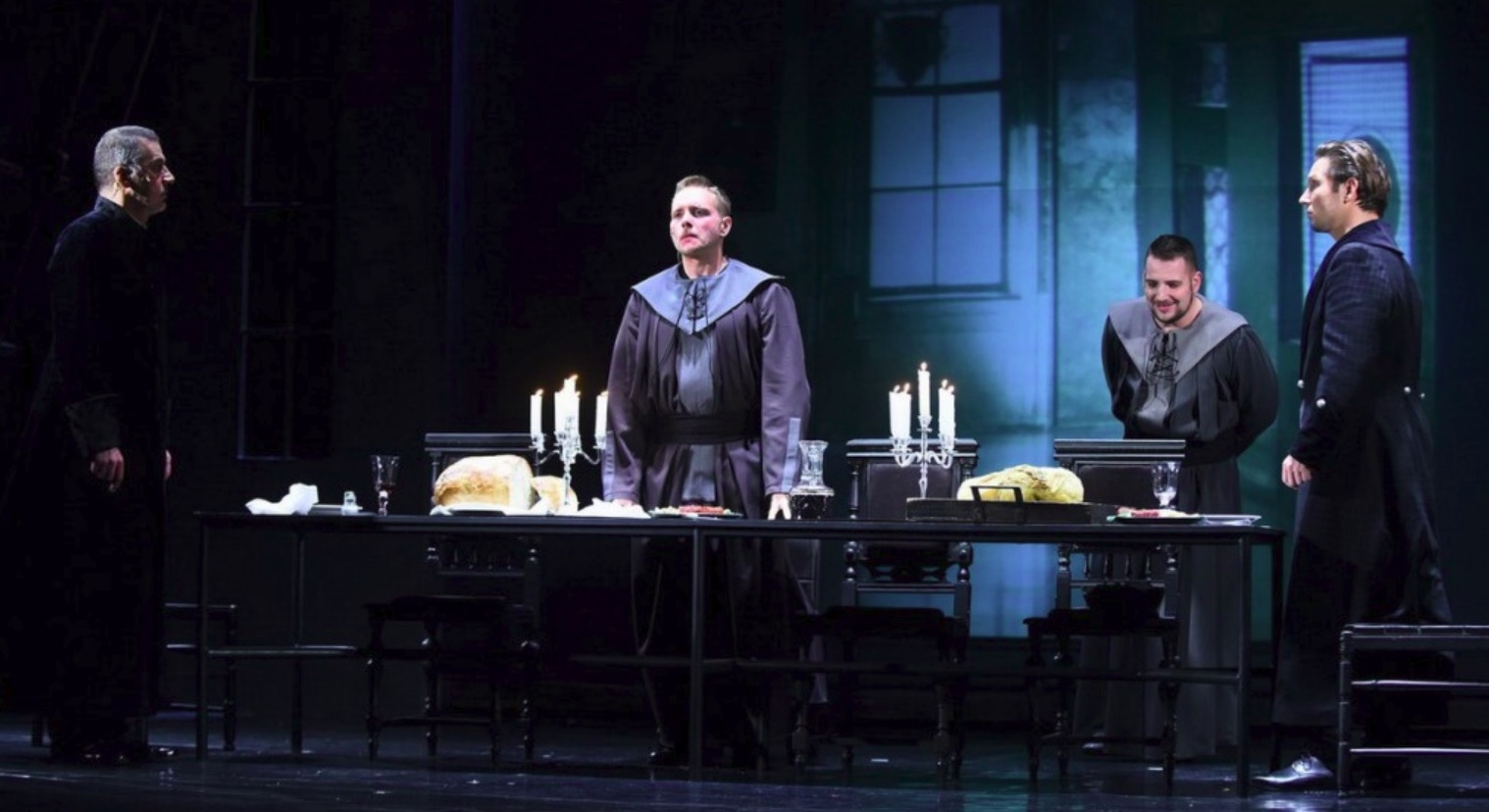 A kontraszt, a különböző ellentétek hangsúlyozása mindvégig jól érzékelhető, hiszen szinte az egyetlen élénk szín a rektor koporsója, amely élénkpiros, képviselve a dinamizmust, az életet – és itt még a halált is az élet hordozza. A fekete-fehérrel szembeni egyetlen piros szimbólumot láttunk már filmes eszközként is, ahol szintén az életet jelezte, itt viszont a halálra emlékeztet, nem is a maga valóságában, inkább a mártíromság, az élet feláldozása az életért jelzéseként. A narratíva így lesz az örök üzenetből kiindulva mégis aktuális kérdéssé, a kontextus textussá. Ha 2017-ben Menekülők egy darab címe, akkor lehetetlen csak visszamerengeni a múltba vesző történelmi időkre.