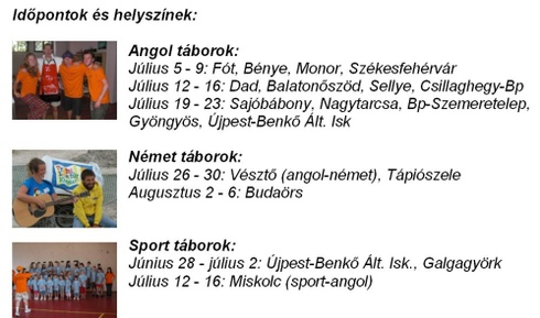 Táboraink brit, német, osztrák (stb) és magyar fiatalok segítségével kerülnek megrendezésre az ország 18 településén, helyi gyülekezetekkelegyüttműködve. A táborainkban a nyelv/sport vonzereje miatt sok olyan gyermek is megfordul, aki máshol nem hall Jézus váltságáról.