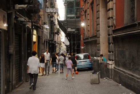 Huszonnégy óra telt el megérkezésünk és első megdöbbenésünk óta, a legtöbben mégis otthon éreztük magunkat az ismerős nápolyi utcákon. Egy krémes habkávé elfogyasztása után páran beálltunk focizni az alkalmilag összeverődött helyi srácok közé az egyik téren. A lejtős placcra egyre többen kezdtek szállingózni, hiszen lenyugvóban volt már a nap, így a kint is hellyel kínáló vendéglátóhelyek pincérei a rúgások mérséklésére intettek – udvariasan, mégis határozottan. Az elegáns és tiszta ruhát viselő hölgyvendégek – hiszen ekkorra már ez is feltűnik –, derűsen, gyönyörködve tűrték a magyar–olasz focimeccs eredményezte rendbontást.