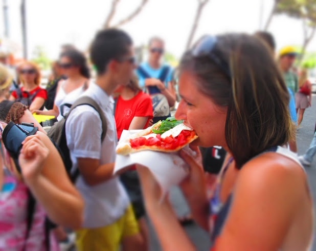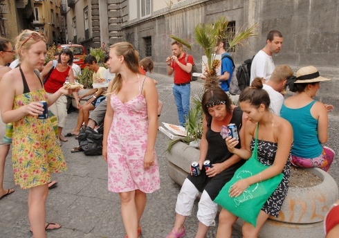 Miután elfogyasztottuk a hamisítatlan nápolyi pizzát – melynek készítőjét tanulva a helyiektől később hatalmas tapssal köszöntöttük egy sikátorban –, két drukker csatlakozott hozzánk – nyilván a csapat ékességei, a vörös hajú lányok vonzották a fiatalembereket. Ahogy szó szót követett, az egyetemistáktól megtudtuk, hogy nincs rendszeres pénzkereseti lehetőségük, ahogy egyikük fogalmazott, Nápolyban „csak túlélnek". Ismerős érzés fogott el.