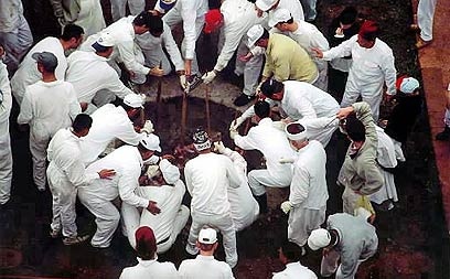 - Évezredeken keresztül mindazok, akik elhozták családjuk bűnéért való áldozatukat, segítettek a szertartásban vagy türelmesen vártak az engesztelő vacsoráig. Hivatalosan ez az aznapi első étel, a családok addig legfeljebb gyümölcsöket esznek. Mivel a szertartás napnyugtakor kezdődik, este tizenegy és éjfél között jutnak ételhez. A tűzhelyet délután óta hevítik, a megtisztított, besózott bárányhúst nyársra tűzik, berakják a földbe vájt, izzó kemencébe, befödik, majd néhány óra múlva az előírásnak megfelelően keserű gyökerekkel és kovásztalan kenyérrel elfogyasztják.
