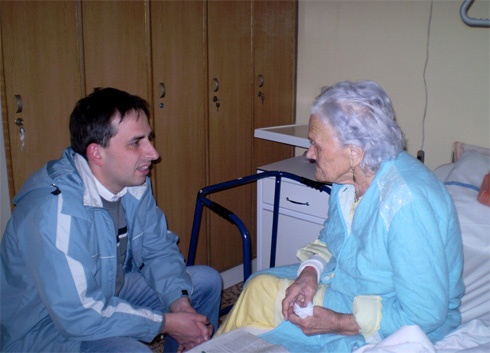 Sokkal egyszerűbb, napi élethelyzet a betegágy melletti segitségnyujtás. Véget ért az az időszak, amikor az egészségügyi rendszerbe utalt beteg néhány hét ápolás, kezelés után „gyógyultan távozhatott". A kórházakba felvett, vizsgálatoknak alávetett, terápiákkal gyógykezelt beteg „ember-hiányban" szenved. Emberre vágyik, aki nem csak leletek számadataiból, vizsgálati eredményekből tájékozódik, hanem meghallja a választ a „hogy érzi magát" kérdésre, aki a tekintetekből is tud olvasni, akinek van pár perce egy kéz-szorításra is. Így lesz „áldottá" az orvos, s nem csak a szaktudás, „kedves nővérré" a mosolygós ápoló, „drága családoddá" a szobatársakra is figyelő rokon - EMBERRÉ a jelenlevő segítő. Persze ezek nem karitatív szolgáltatások, de a szeretet szolgálatai a másik, bajban levő felé. A szeretet-áradás pedig oldja a kiszolgáltatottságot, reményt kelt, csendesít, sőt még a hiányokat is elviselhetőbbé teszi.
