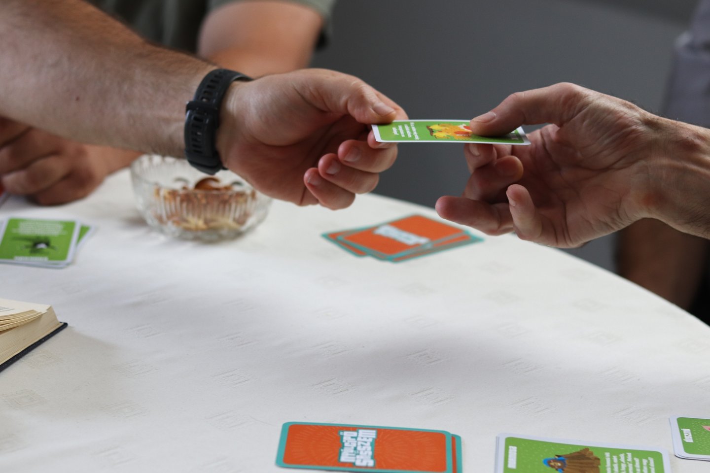 Ekkor még egyszerű, fáradtsárga lapokra nyomtatott betűkódokkal próbáljuk ki a játékot: a fejlesztők feljegyzik, hogy a kártyapárok keresését fel kell gyorsítani, mert így vontatott a játék. Miklya Zsolt szabálymódosítást jelent be.