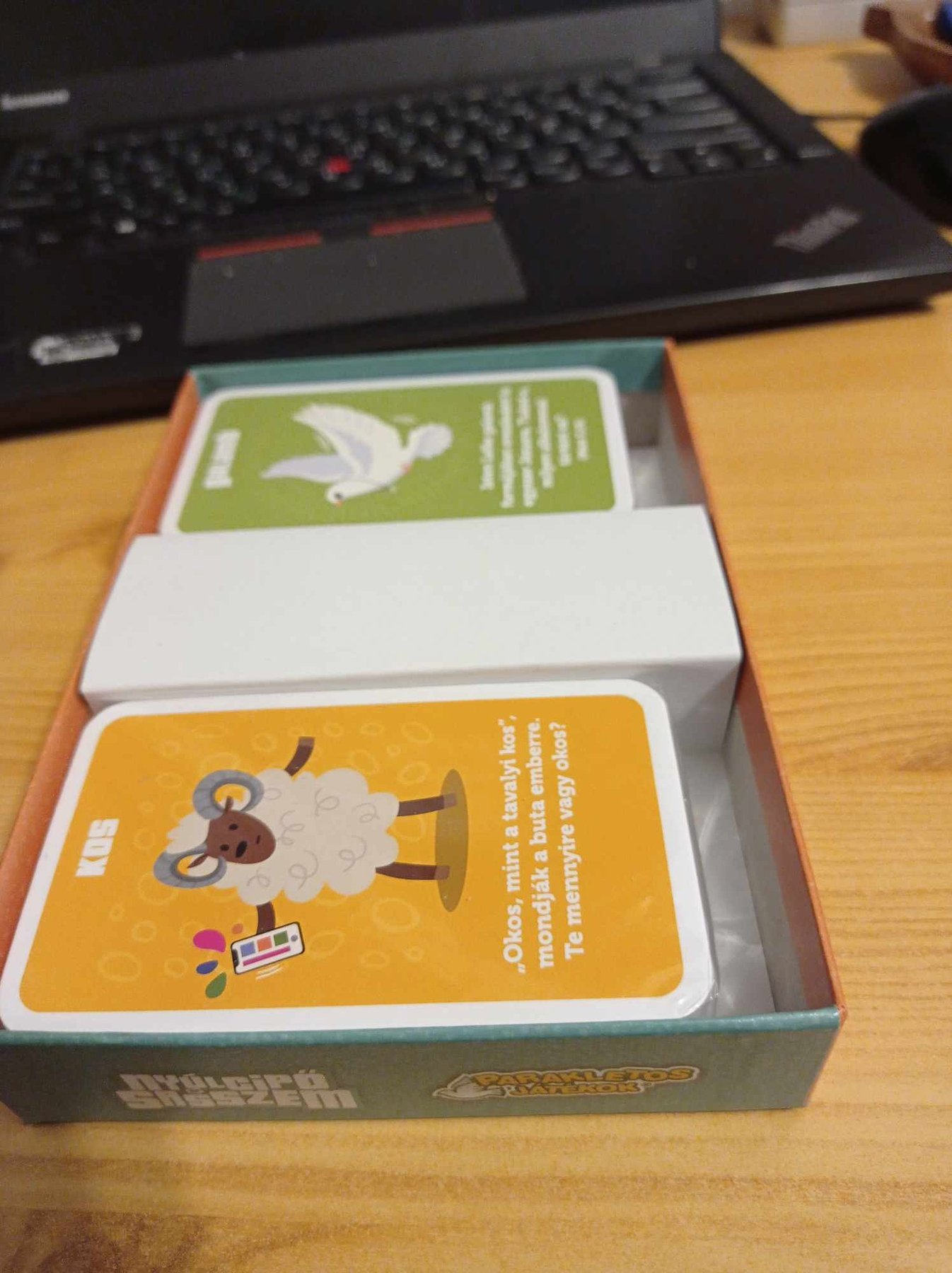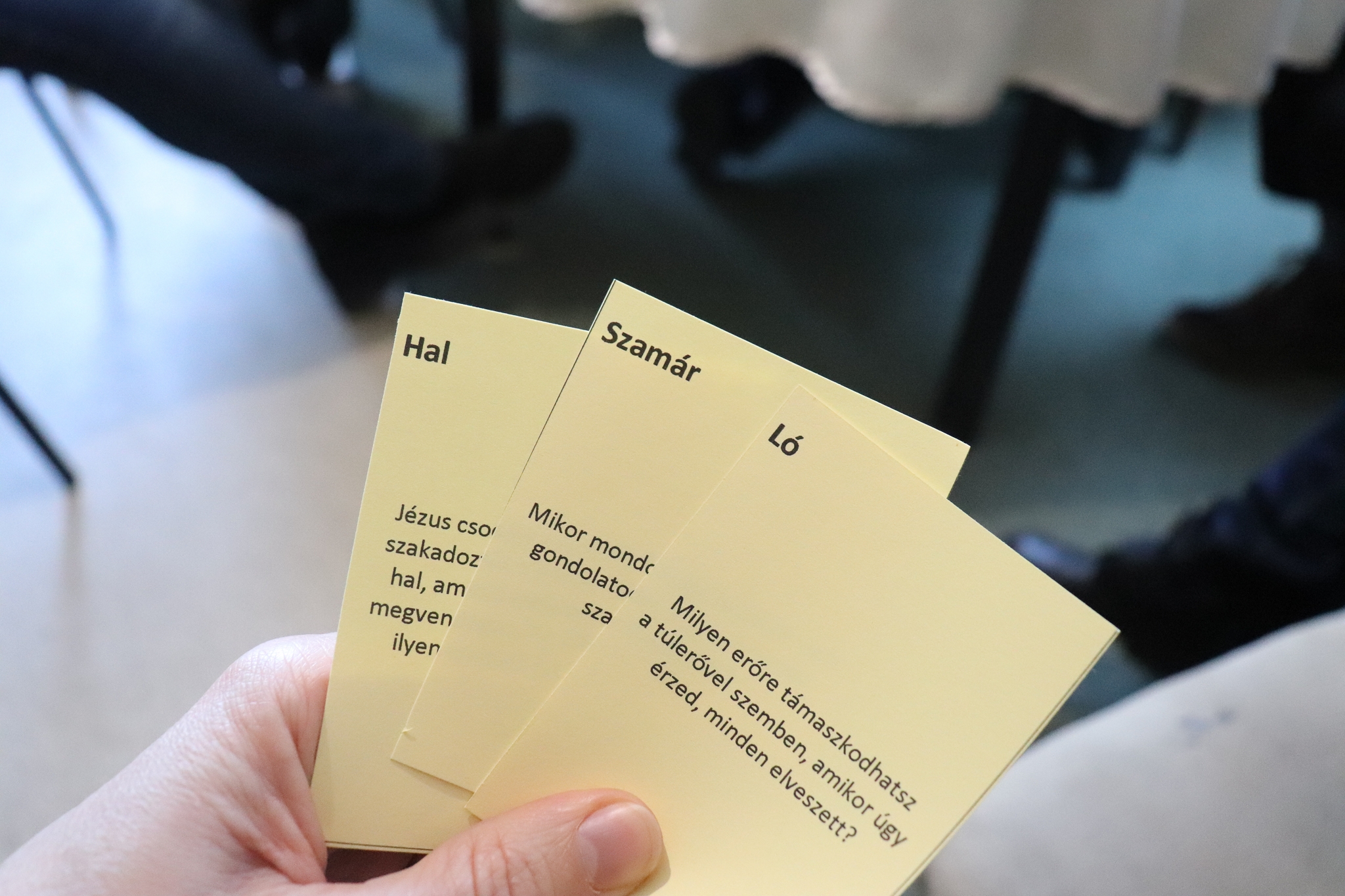 A kártyákon a gyerekeknek is szerepelnek könnyű, a Szentírás ihlette vagy épp személyesebb kérdések, utóbbi például a hiénakártyán: „Sorolj fel hármat a nem a legszerethetőbb tulajdonságaid közül!” Ha valakinek kényelmetlen egy kérdés, egyszer passzolhat.