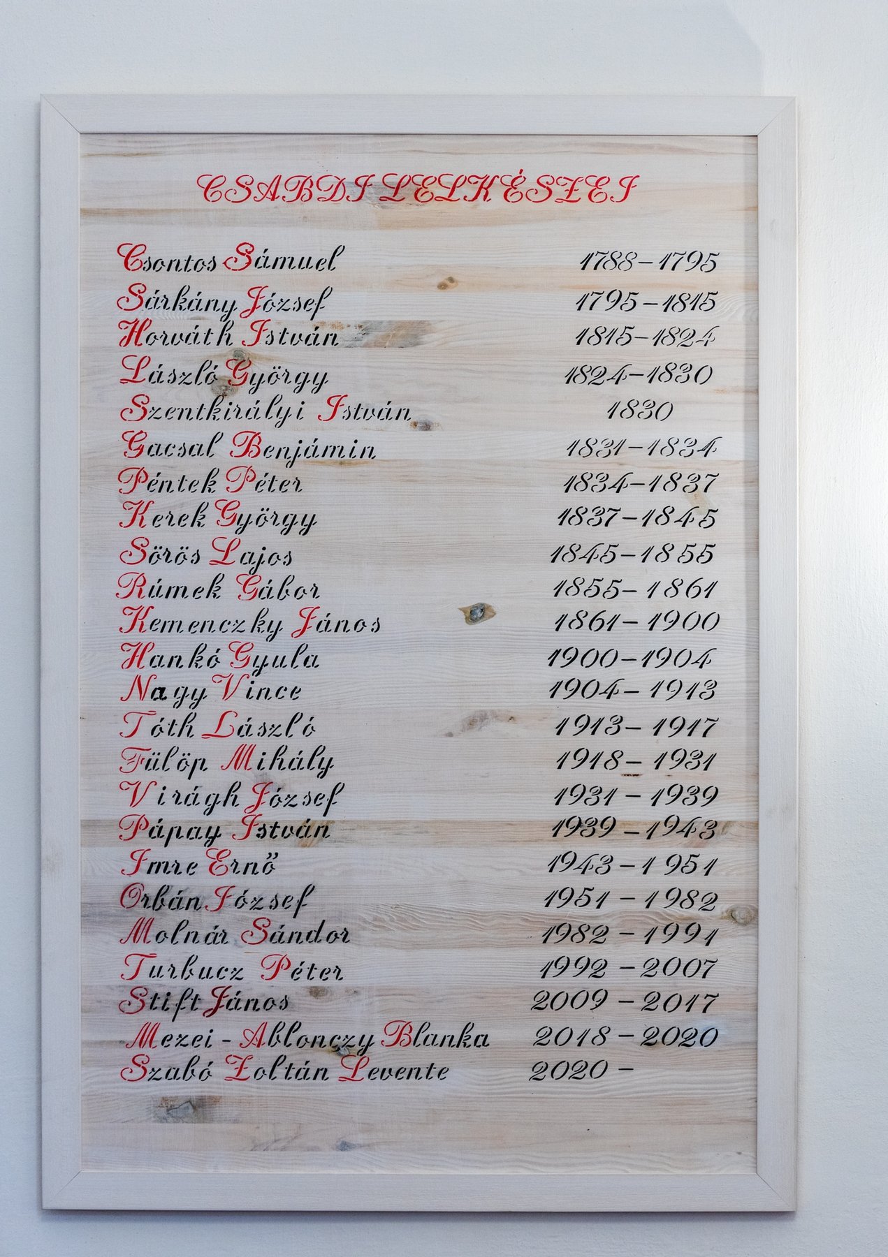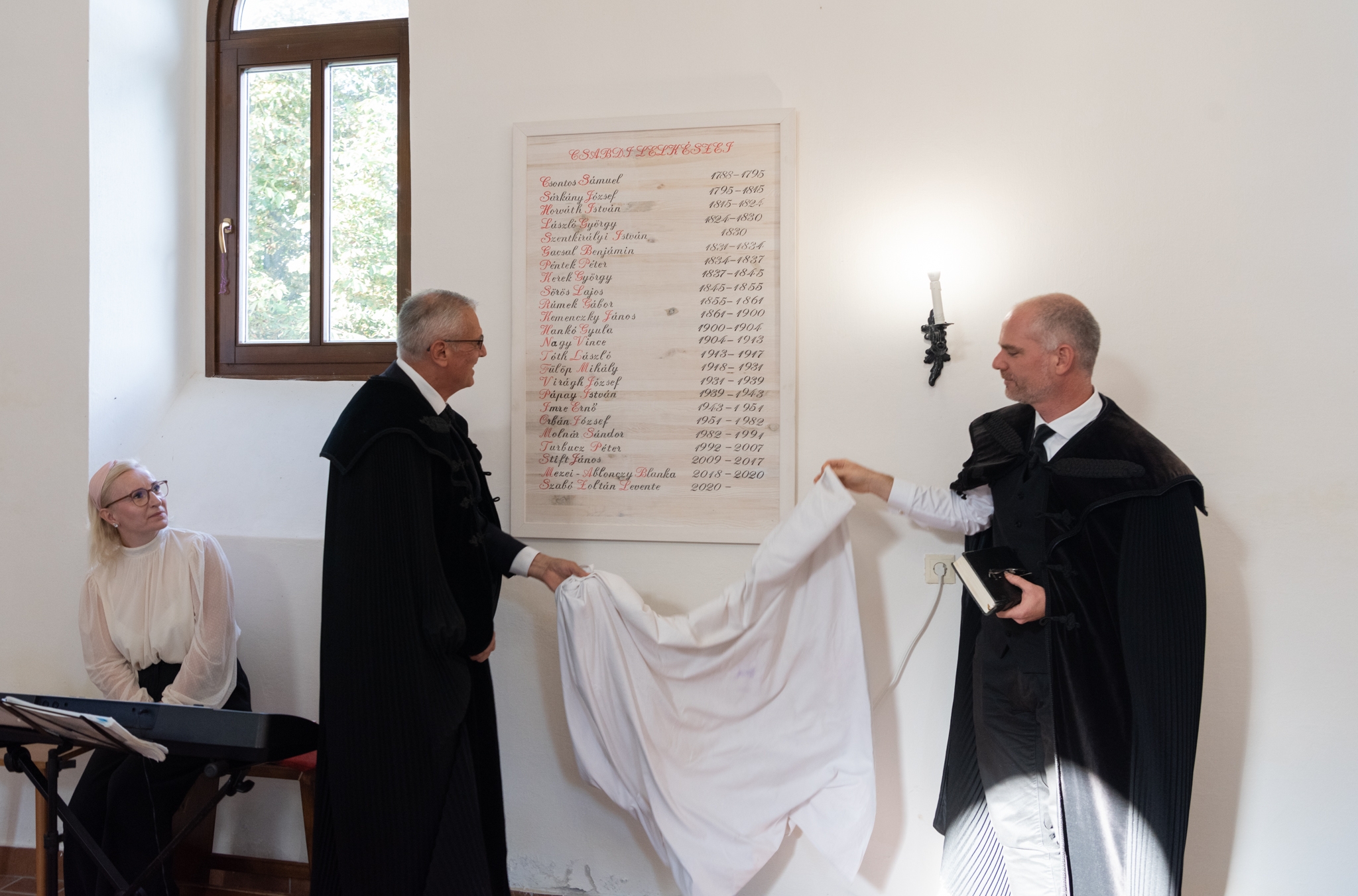 A megjelent vendégek köszöntése után a gyülekezet lelkipásztora, Szabó Zoltán Levente és a Vértesaljai Református Egyházmegye esperese, Hajdú Szabolcs Koppány leplezték le a lelkipásztorok emléktábláját. „Van-e értelme a neveknek? Ha nem emlékszünk a felmenőinkre sem, van-e értelme annak, amit csinálunk?” – tette fel a költői kérdést a lovasberényi lelkipásztor. „Rengetegen voltak itt Csabdiban, akik az Úrnak szolgáltak. Ha nem lett volna bennük ez a tartás, mi ma nem lennénk itt. Ez biztasson minket, hogy hatásunk van a jövőre. Legyen ott minden percünkben a tudatunkban, hogy a jelenben egyszerre dolgozunk valakik jövőjén és múltján.”