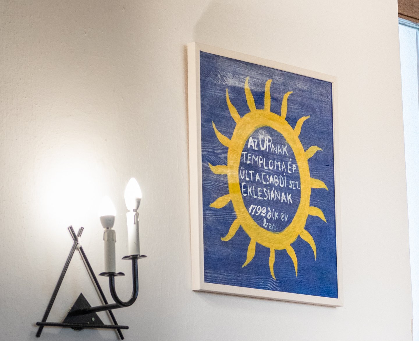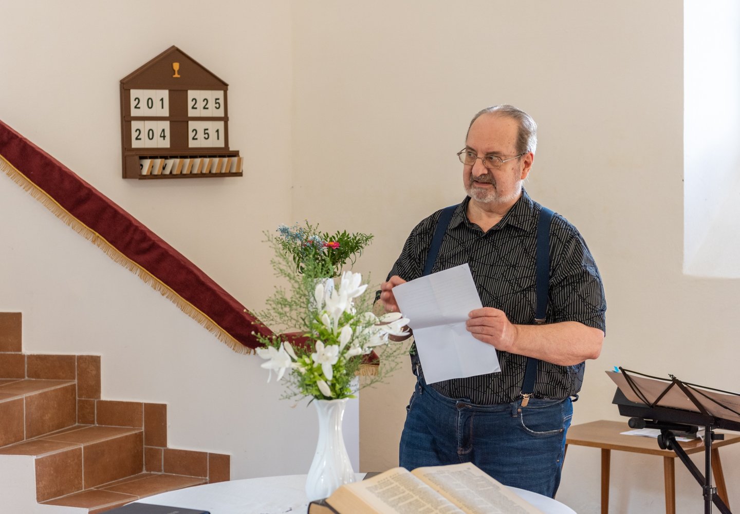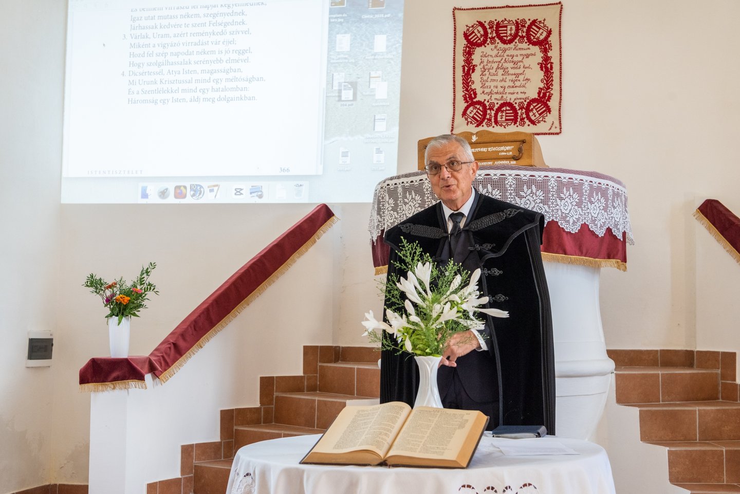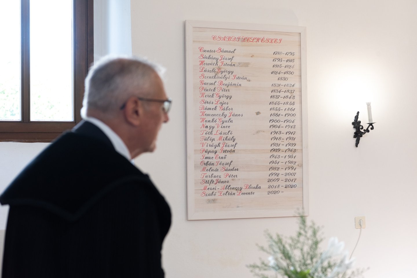 A hálaadó istentisztelet végén a csabdi református gyülekezet lelkipásztora, Szabó Zoltán Levente felhívta a figyelmet a templomban található gyülekezettörténeti kiállításra, a falakon lévő mennyezetkazetta-másolatokra, illetve egy installációra, mely a lelkipásztorok emléktáblájának munkafázisait örökítette meg.